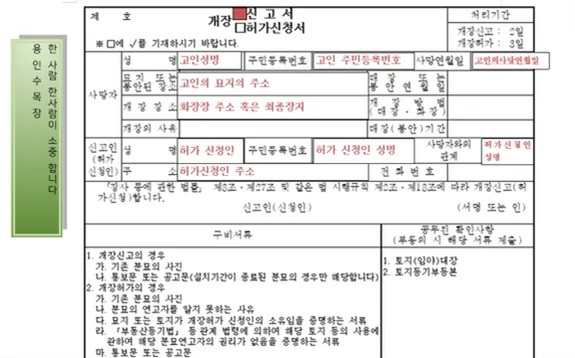 | TIP | 묘지개장신고는 이장을 하기 15일 이전에 관할 관청에서 “개장 신고 필증“ 서류를 미리 발급 받아 준비하시면 보다 더 편리하실거에요 |
